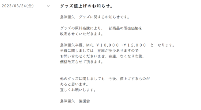 • 島津亜矢コンサート2023のグッズ半纏の在庫は価格が10,000円の半纏は終了して現在は12,000円の価格のみの半纏があります。
